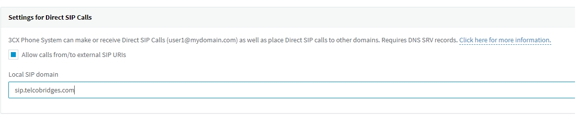 1 - Go to Settings -> Advanced -> Network -> FQDN -> Settings for Direct SIP Calls, Click to Allow calls from/to external SIP URIs and enter the domain name you entered in the ProSBC SIP Domain configuration.