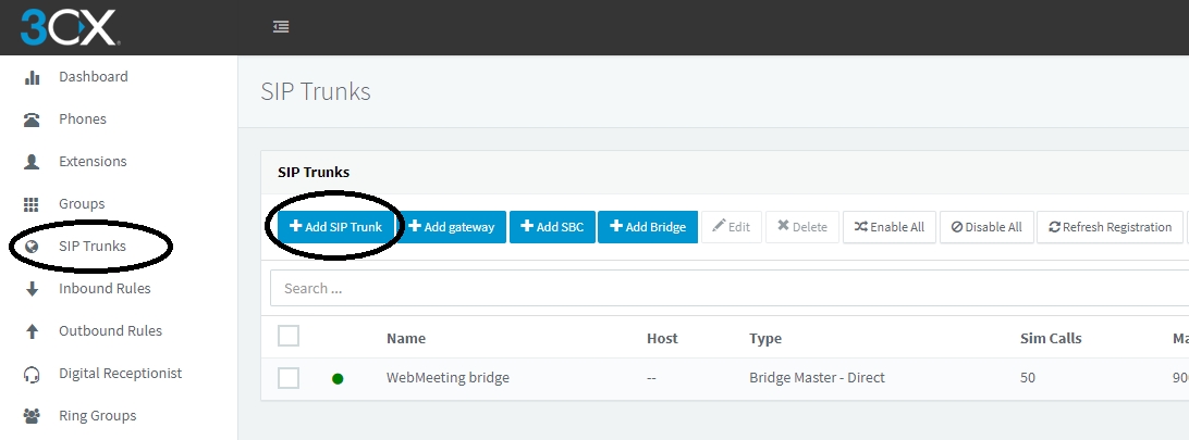 1 - Click to SIP Trunks in 3CX Web GUI and Click to Add SIP Trunk button