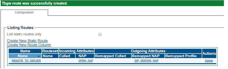 4- Verify that the " Route was successfully created" message appears and that the new route is listed in the Routeset list