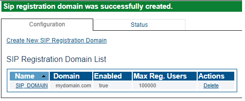 4- Verify that the Sip registration domain was successfully created message appears