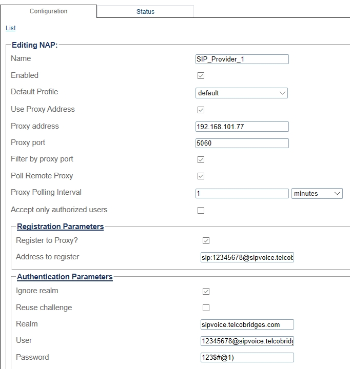 SIP registration to SIP Proxy (NAP) can be configured in the NAP editing page: