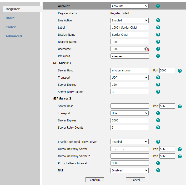 Register Name - Authentication name configured in the SIP server for this user. Usually, it is the same as the username.
