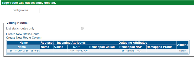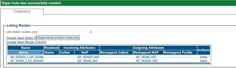 4- Verify that the "Route was successfully created" message appears, and that the new route is listed in the Routeset list