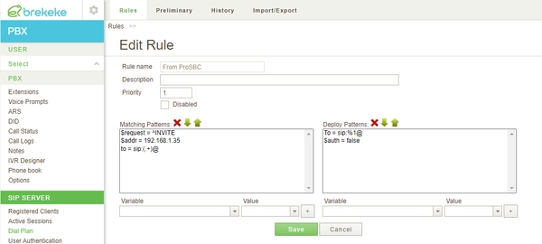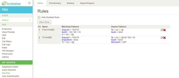 The Brekeke PBX includes the Brekeke SIP Server. The SIP server of the Brekeke PBX includes several dial plan rules. In order to establish the communication between ProSBC and the Brekeke PBX Server using the SIP protocol, you need to declare the necessary dial plan rules with their matching patterns.