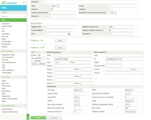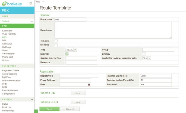 4 - You need to create a new ARS pattern for registered users to call out from ProSBC. Go to PBX -> ARS and click to New Route