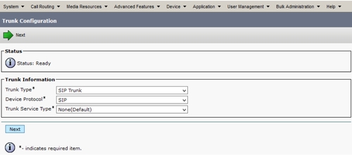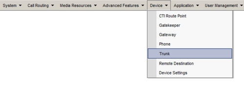3. A new SIP trunk can be created by selecting the Trunk entry through the Cisco Unified Communications Manager Device menu.