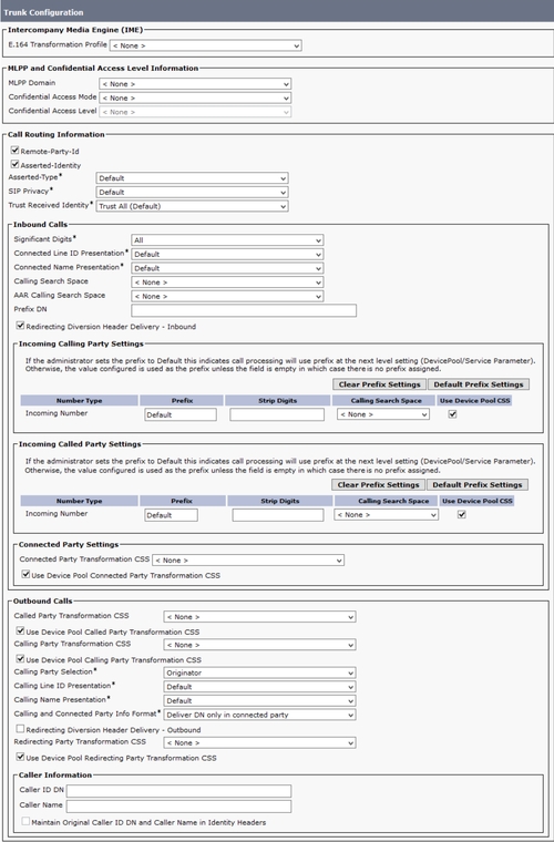 6. For the Call Routing Information (Inbound and Outbound Call) the parameter Redirecting Diversion Header Delivery has to be set. This enables the delivery of the origin and redirecting number through SIP. All other parameters are used with their defaults.
