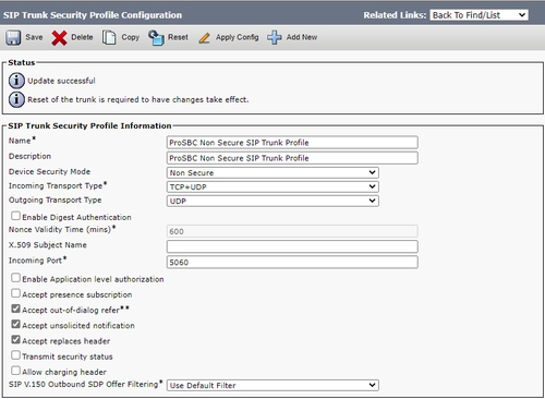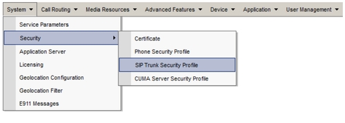 1. First of all it is necessary to specify a SIP Trunk Security Profile which has to be applied to the ProSBC SIP trunk. The SIP Trunk Security Profile can be created or changed through the Security submenu of the System tab