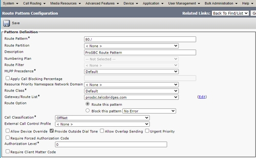 9. In this example the route pattern 80.! is used for ProSBC’s SIP trunk prosbc.telcobridges.com.