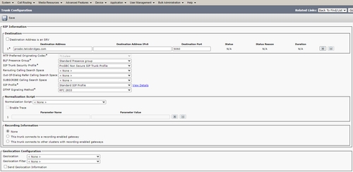 7. In this example the Destination Address is set to the hostname prosbc.telcobridges.com. The SIP Trunk Security Profile is set to ProSBC Non Secure SIP Trunk Profile. The DTMF Signaling Method is used with RFC 2833.