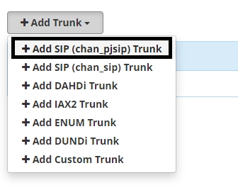 1. After logging in as an Admin to your FreePBX GUI, navigate to “Connectivity” → “Trunks” and press the “Add Trunk” button. Select the option “Add SIP (chan_pjsip) Trunk”