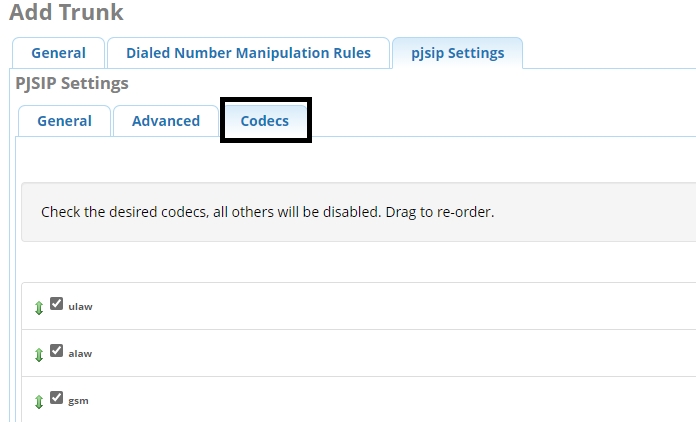 4. Once done, select the “PJSIP Settings” → “Codecs” Tab. Ensure correct codec are selected.