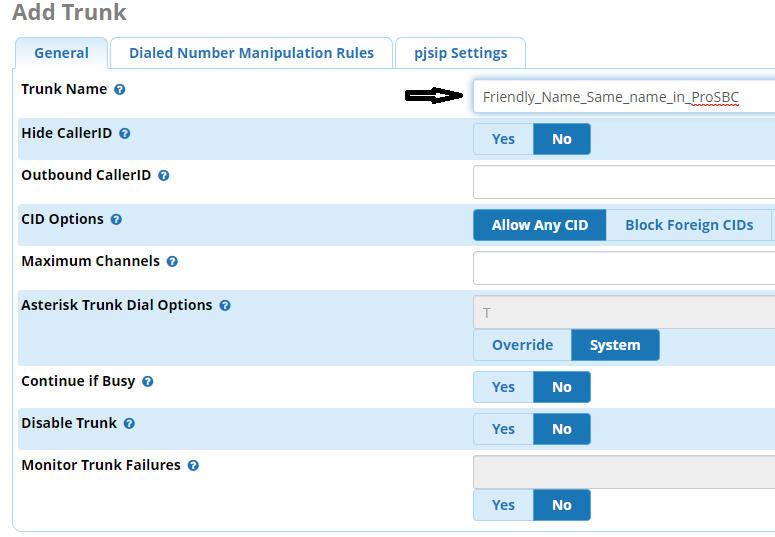 2. Once done, this will bring up the Trunk Creation Screen. Under the General tab, enter a name for the trunk. For ease of management, It is recommended that this match the name of the SIP Endpoint you created in the ProSBC WebGUI for FreePBX NAP.