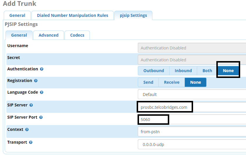 3. Once done, navigate to the “pjsip Settings" → "General” tab. Here you will need to enter your endpoint information. If you're using an IP endpoint,