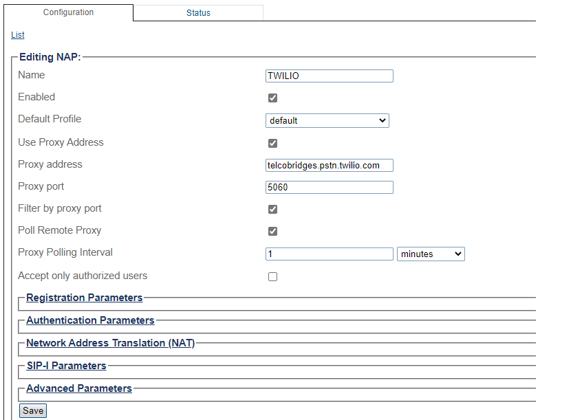 NAP Configuration for Twilio Elastic Trunking