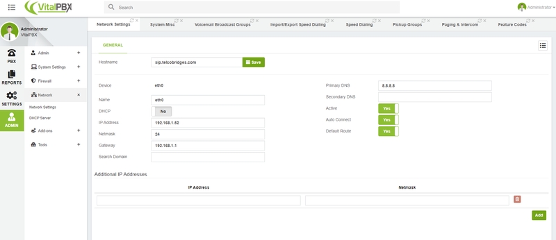 2. Select the Admin -> Network From the left menu to set the hostname of the device. In our example, it is set to sip.telcobridges.com