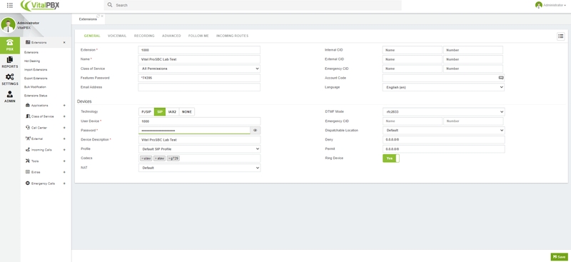 This document provides instructions on how to add an extension to VitalPBX Server to work with the ProSBC. Please visit the following link for more details about Creating an Extensions in VitalPBX Server