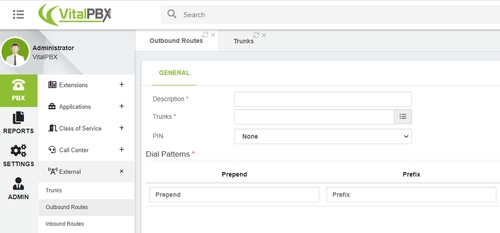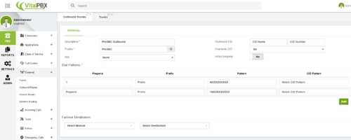 5. We need to create an outbound route for this new trunk. Select the PBX tab at the top left and then from the drop-down menu click External -> Outbound Routes.