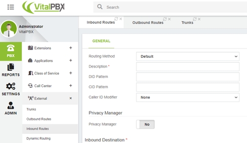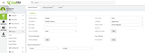 7. We need to create an inbound route for this new trunk. Select the PBX tab at the top left and then from the drop-down menu click External -> Inbound Routes.