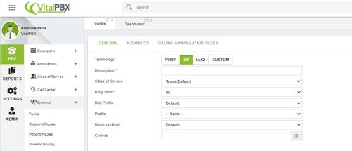 2. Select the PBX tab at the top left and then from the drop-down menu click External -> Trunks.