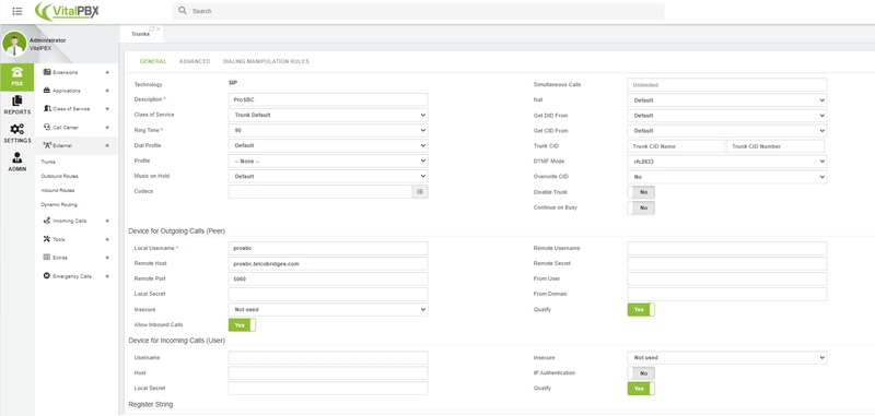 This document provides instructions on how to add a SIP Trunk to VitalPBX Server to work with the ProSBC. Please visit the following link for more details about Creating a SIP Trunk in VitalPBX Server