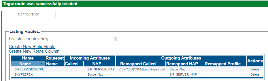 4- Verify that the "Route was successfully created" message appears, and that the new route is listed in the Routeset list
