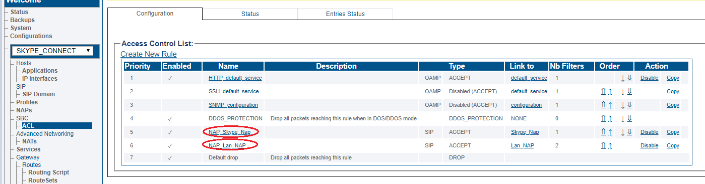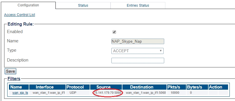 If you double click one of the created ACL, you will see ProSBC only accept the calls if the source IP matches. In this sample; the calls from 78.141.179.70 (sip.skype.com) will accepted only.