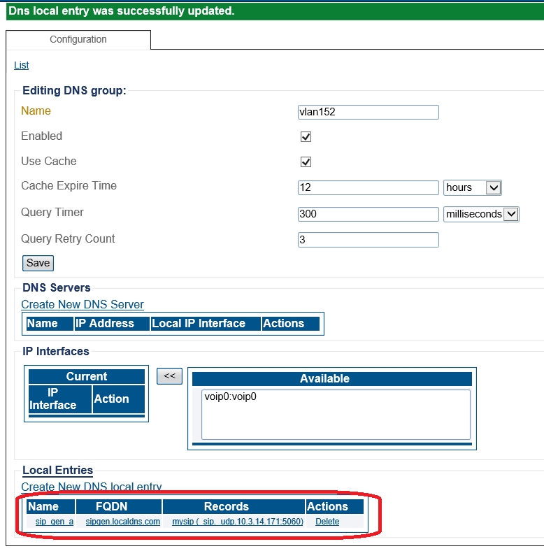 6- Verify that the DNS local entry was successfully created message is displayed.