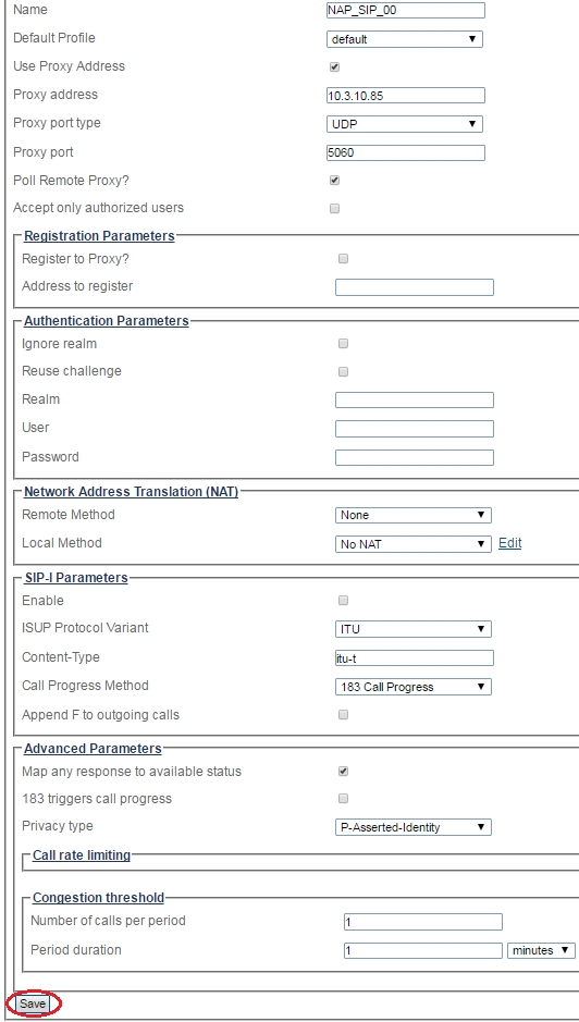 The SIP transport server will determine the local IP Address and port from which this NAP will be communicating with remote SIP devices. Note: It is not recommended to use multiple SIP transport servers in one NAP, because NAP availability may be inconsistent if one of the transport servers is down. For redundancy, it's recommended to create two NAPs and create redundant routes that point to each NAP (using weighted load sharing, or priority routing, as required).
