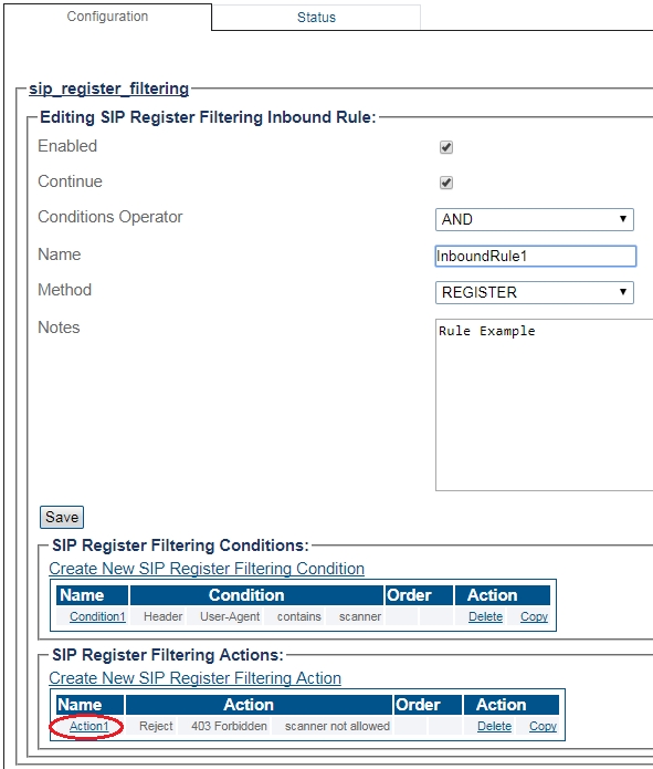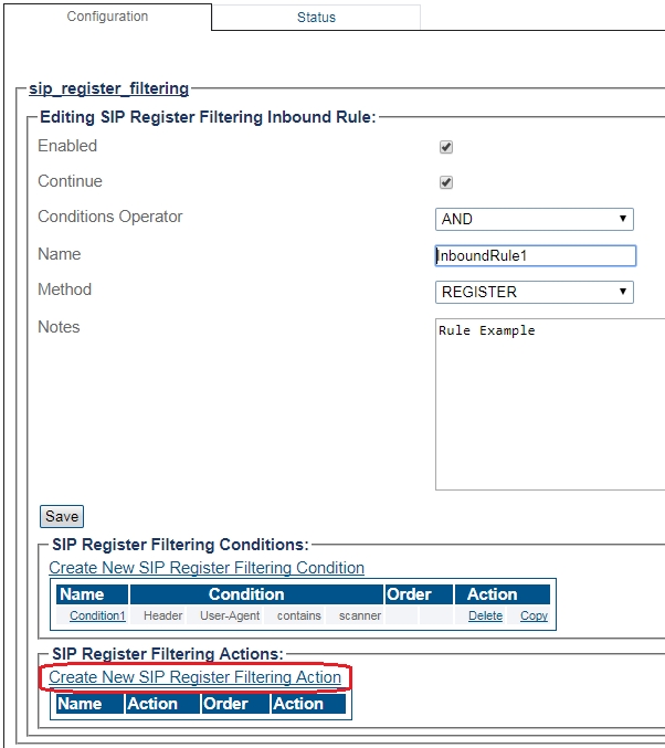 3- Verify that the Sip register filtering rule action was successfully created. message appears