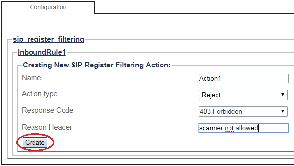 Enter a Name for this SIP Register Filtering Rule Action. Default action name suggestion will appear in text box.
