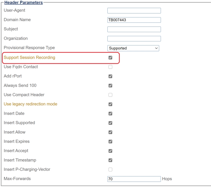 ProSBC supports Session Recording Protocol (SIPREC) forwarding. To learn how to configure the SIP stack, refer to Creating a SIP Stack. In addition, to accept SIPREC forwarding, you must enable the Support Session Recording parameter in the Advanced 'Header Parameters' of the SIP stack.