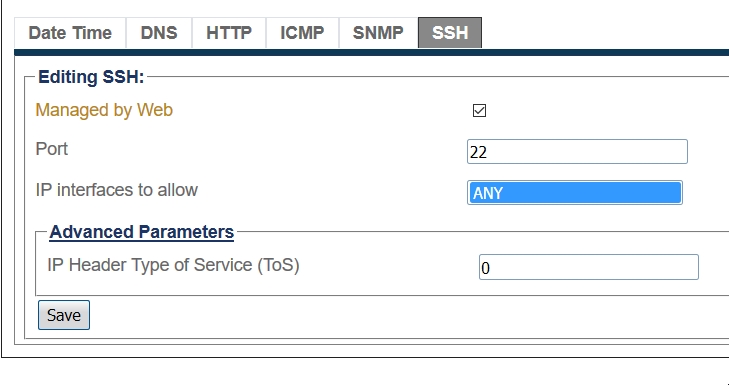 2- SSH services can be managed by the Web portal. To do so, select Managed by Web. 3- Choose the TCP Port on which the SSH service will run and the IP Interfaces to allow for the SSH connection (Default is 22). 4- The Type of Service (TOS) can also be configured.