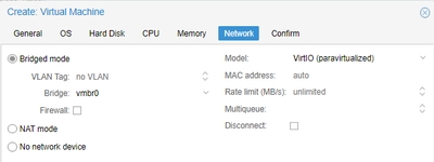 7. Network: Set up the interface you will use for management according to your network configuration. Model VirtIO tested, any other may work too.