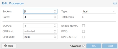 4. CPU: choose core count. Important: CPU Type must be set to "host".