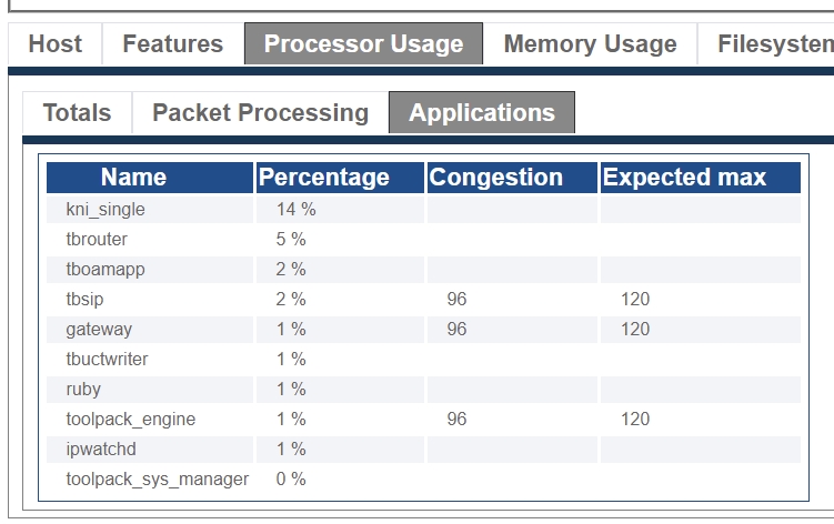 3181 root 20 0 10876 672 536 S 1.0 0.0 224:56.18 ipwatchdHere we see the processor usage is 70% idle. We also see the tbrouter application is at 101% CPU, which is normal. You can have more details here: Toolpack_Application:tbrouter