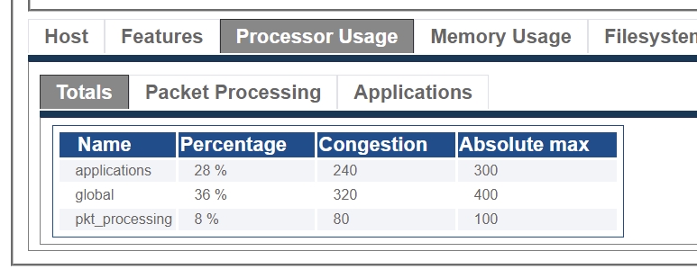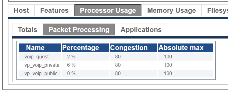 Hosts -> Status -> Select Host -> Processor Usage tabTotals view show the global processor usage, and processor usage divided between applications and SBC processing