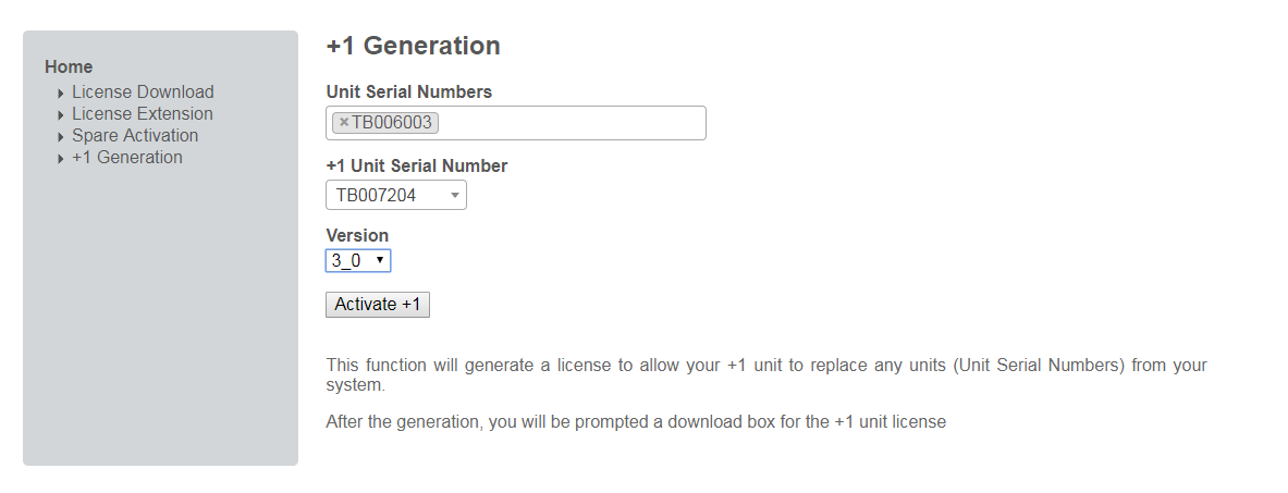 Click Activate +1. This will copy all licensed features from 'Unit Serial Number' to '+1 Unit Serial Number' and activate the +1 unit.