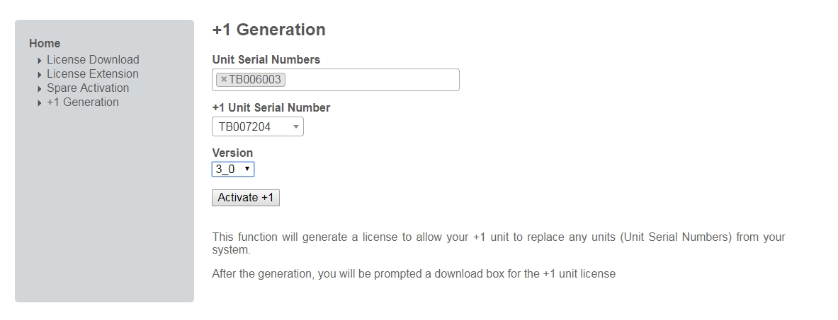 This function will generate a license to allow your +1 unit to replace any units (Unit Serial Numbers) from your system.