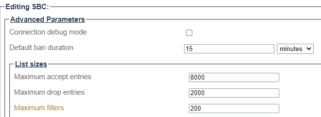 SBC -> Advanced Parameters -> List sizes -> Maximum accept entries: 8000