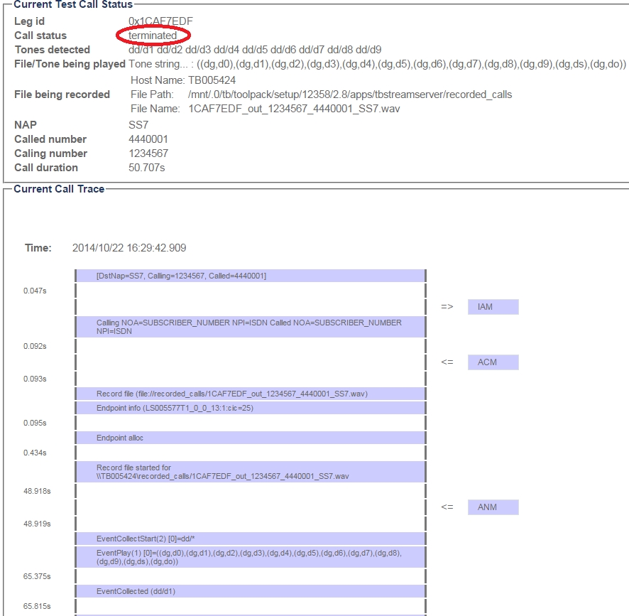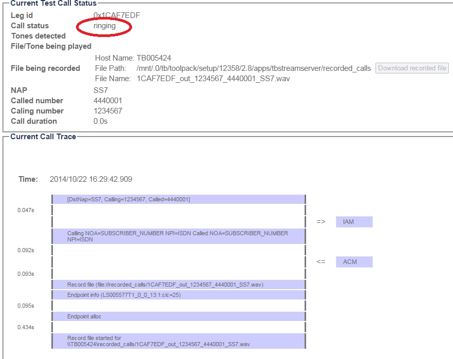 As the call is placed the Current Test Call Status and Current Call Trace regions are updated as the call progresses.
