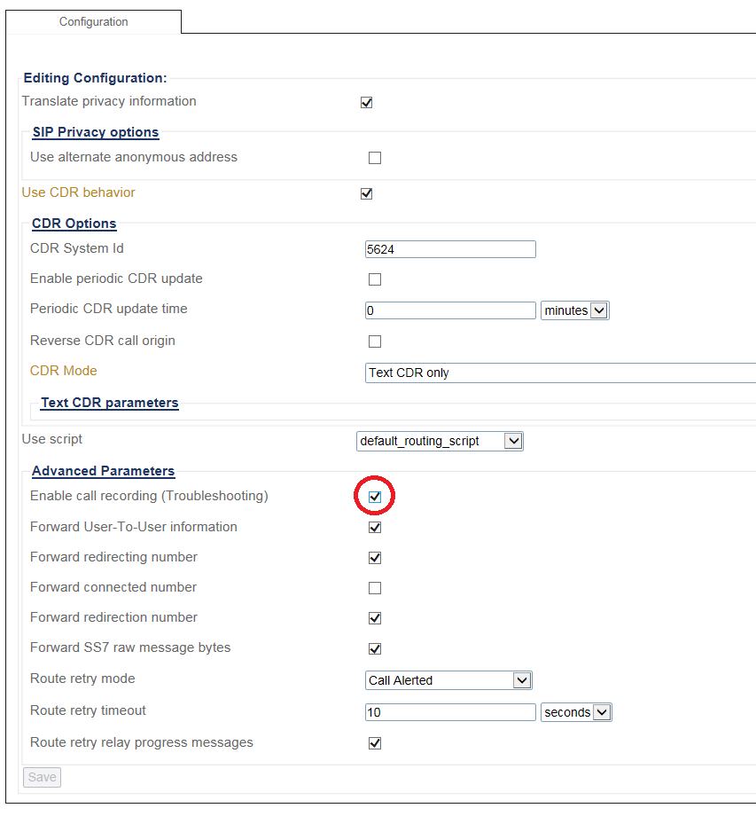 3- Set the Enable Call Recording (Troubleshooting) checkbox.