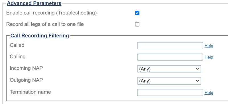 Filtering options are combined in an "AND" manner. A call will be recorded only if it matches "ALL" of the specified filtering options (calling number, called number, incoming NAP, outgoing NAP). Any filtering option left blank is ignored.